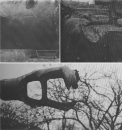 слева — пробитие маски в районе пулемёта, справа — рикошет от правого края башни, а снизу — раскуроченный дульный тормоз