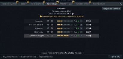 или бесплатно изучается в процессе игры на технике для которой уже приобретена квалификация «Эксперт». Увеличивает уровень владения всеми навыками экипажа на 20%. То есть, с квалификацией «Ас» полностью изученный навык экипажа имеет 100% эффективности.